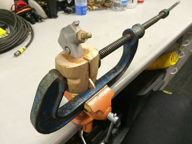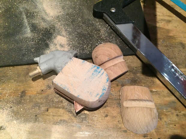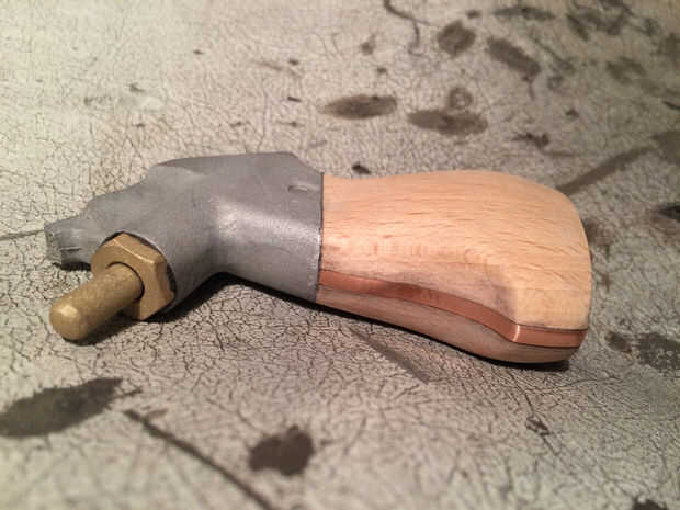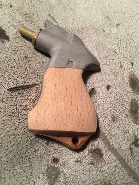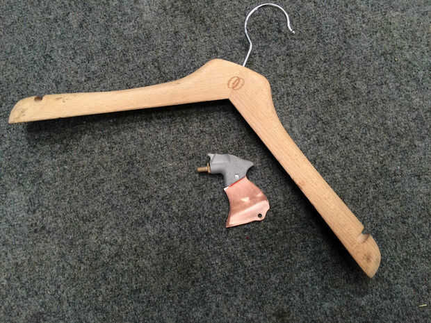 La madera de la empuñadura fue cosechada de un viejo perchero. Simplemente corte los dos extremos de la percha y utiliza epoxi y una pinza para pegar en. Una vez que había secado había aserrado los lados planos y había presentado en forma. He utilizado una hoja de papel de lija de grano 180 para acabar con la empuñadura y había tratada la madera con una cera líquida.
