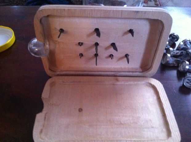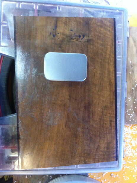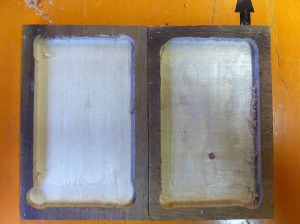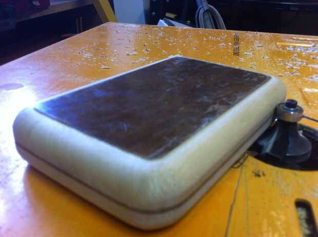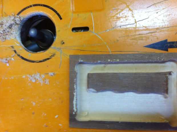 Primero por cortar la madera al tamaño (14 x 8 x 1 cm) lo suficientemente grande como para sostener el control remoto (como se ve en la imagen siguiente). La madera debe ser lo suficientemente gruesa como para permitir que todo se pone dentro, incluyendo las palancas para operar el control remoto. Entonces enruta la madera hacia fuera para crear espacio para la electrónica antes de las esquinas redondeadas. Pegan las dos piezas de madera. Al día siguiente, una vez que el pegamento se haya secado, forma el los bordes exteriores con un router. Dividirlo (con una sierra de banda, es más fácil que cortar mano) justo al lado de centro (i.e.not donde se pegan las dos mitades). Los agujeros primeros que corté las llaves no funcionó para mí, aunque me gustó mucho las teclas typewrite negro de que los tallos fueron centro, usé las llaves de blanco de la máquina de escribir que tenía el tallo en el centro del botón. También los agujeros no estaban muy bien situados aunque la cuadrícula marqué fue uniformemente. Taladré un agujero en la parte superior por una cúpula de cristal (de la glorieta) para el transmisor de IR.