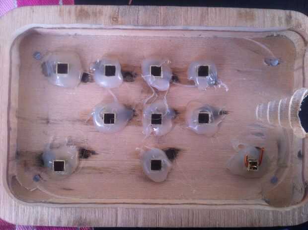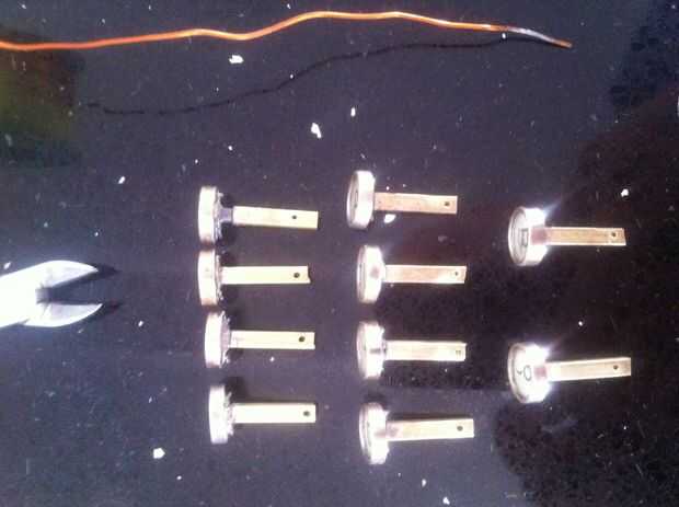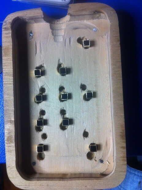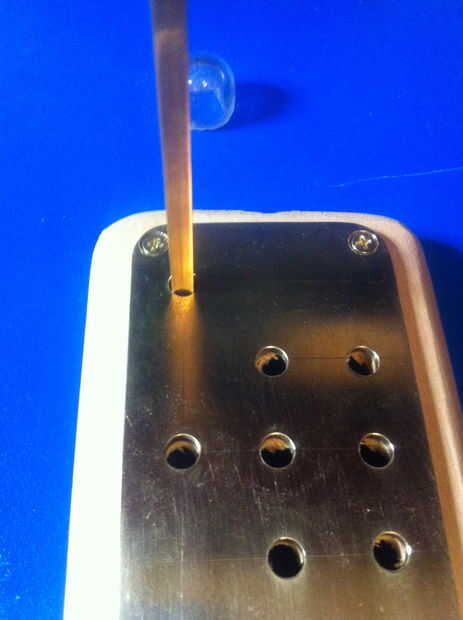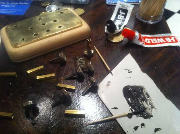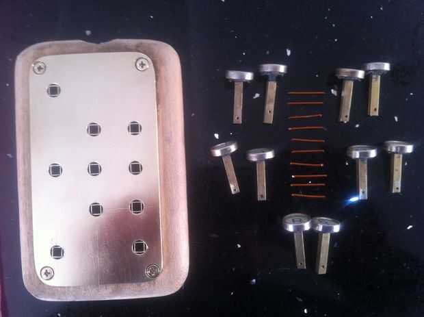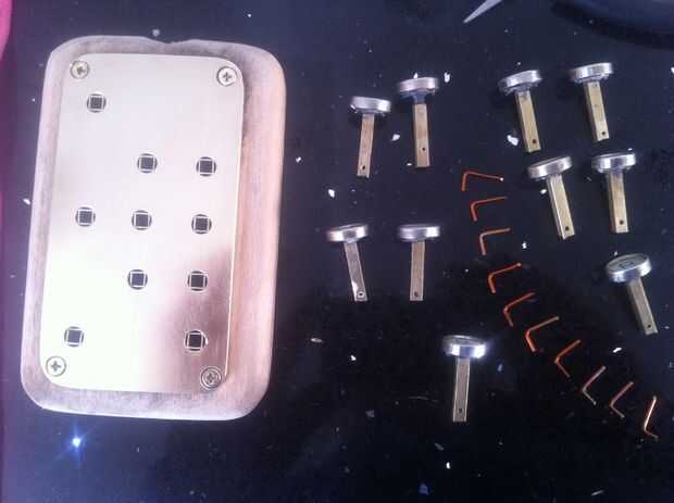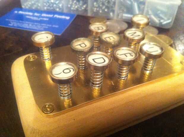 Cortar todos los tallos a las teclas de la máquina de escribir a un tallo cuadrado pequeño para caber dentro del tubo cuadrado de latón que se cortan en tiras de 2cm. Los tallos se ajustaron en los tubos. Se perfora un pequeño agujero en la parte inferior del tallo para un alambre que sostenga las teclas en su lugar (ver fotos). El tubo de latón externo (corte a tiras de 1cm) era caliente pegado en la placa de cobre amarillo (sí ya sé... redondo peg, cuadrado agujero... aquí '' s viceversa). Los tubos cuadrados mantendrá las claves orientadas correctamente (mina es un poco flojo, no estaba prestando atención). Deslice los resortes sobre los tallos y comenzar a poner en el teclado. Asegure las teclas con el alambre y doblar los alambres para que no caiga hacia fuera.