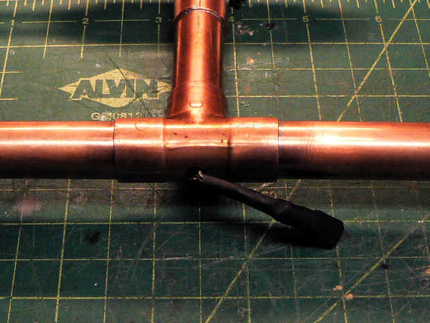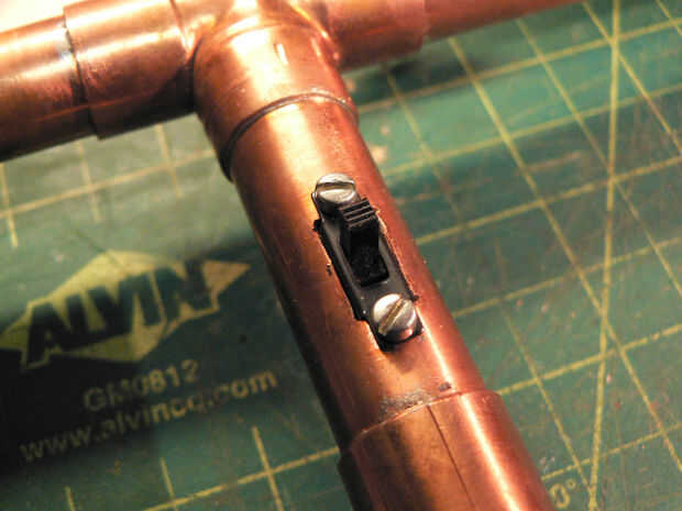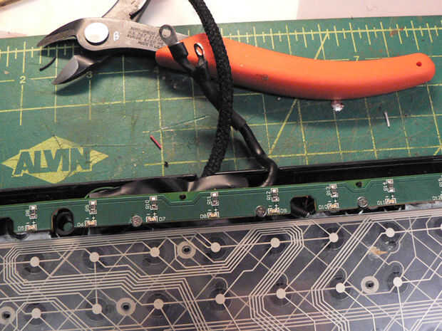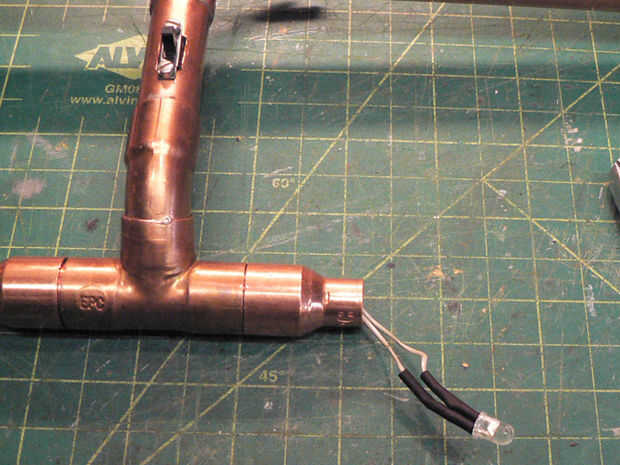 Los cables de los LEDs fueron empujados a través de los tubos de cobre y un interruptor on/off situado en la pieza recta y finalmente conectado a los cables de 5V del teclado. Yo hubiera esperado para que sea más brillante pero creo que voy a tener que idear algo diferente. Sin embargo, una vez que los ojos se acomodan es lo suficientemente brillante para escribir en un cuarto oscuro.