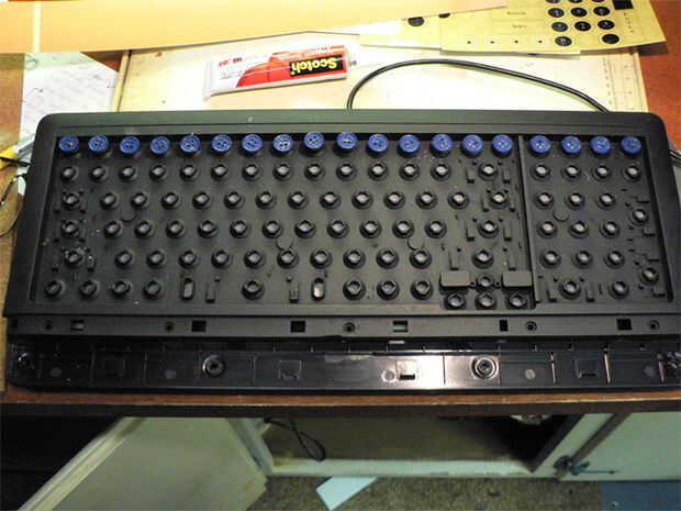 Introducir completamente los tallos en el teclado. Luego, con pegamento de contacto, poner los botones en la parte superior del tallo. Comencé en el medio y que obtener la fila tan recto como sea posible! Que apalancar unos clave-tops (botones) retroceden y volver a pegado porque eran sólo desalineados :/ Una regla ayudaron con este trabajo y creo que, al final hice un buen trabajo.