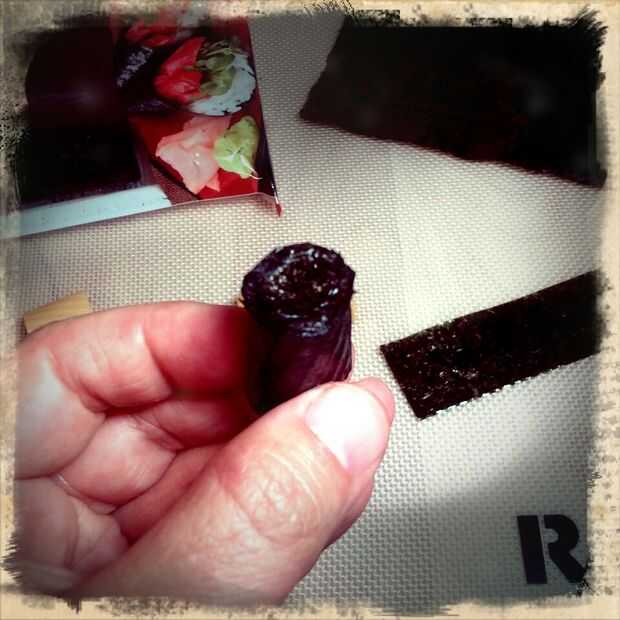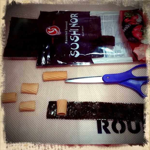 2. Enrolle el alga completamente alrededor de los tallarines y luego cortar el exceso de uno de los extremos. Sumergir los dedos en un vaso de agua para ayudar a sellar las algas a los tallarines. Ahora corte las algas exceso restante en aletas como tal.