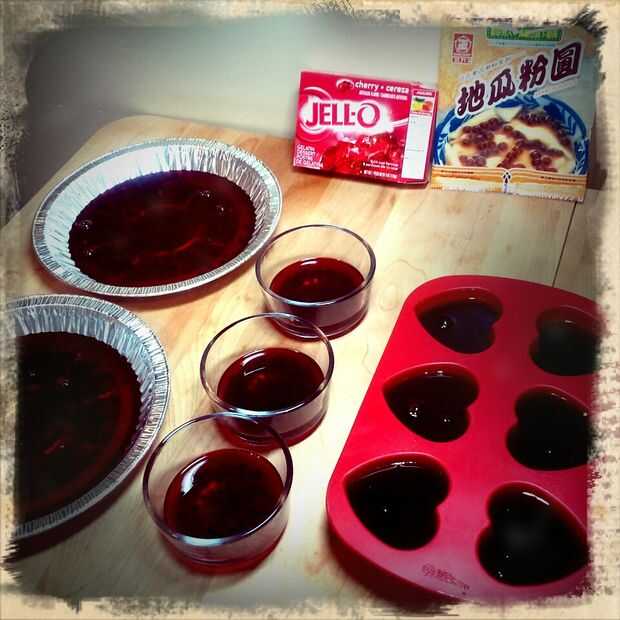 Hervir 4 tazas de agua. Una vez que el agua ha llegado a hervir, añadimos las bolas de almidón. Cocinar bolas de almidón durante 40 minutos o hasta que todas las bolas son completamente claras. Una vez claras las bolas de almidón, añadir la gelatina de cereza y cocinar hasta que se disuelva la gelatina de cereza. Retirar del fuego y agregar 2 tazas de agua fría. Luego Vierta en pasteles platos o entrañas de cristal o bandejas de muffins de silicona. Tapa con plástico y colóquelos en el refrigerador.