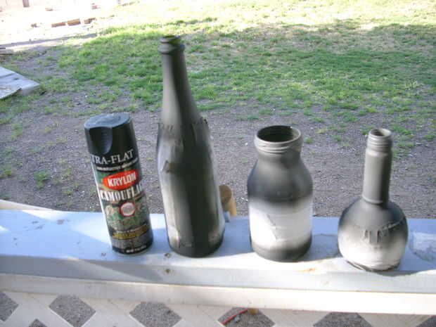 Enmascarado de nada que no quiero aerosol pintado con cinta de enmascarar, naturalmente. Después de eso, fue sólo pulverizar una buena base de plano negro y luego agregar la capa superior. Elegí una buena plata para la jarra y cobre martillado para la botella.
