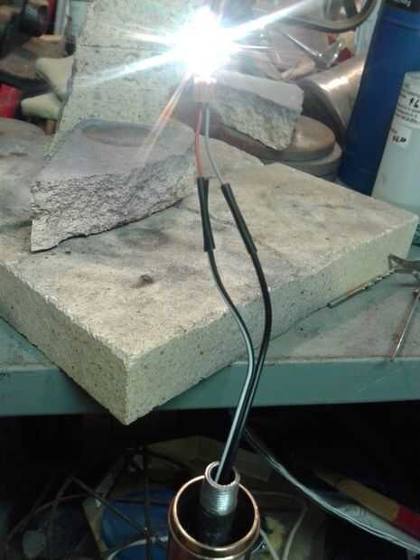 Usé un enchufe mini que fue Ripeado de un viejo VCR para enchufar el foco mini maglite en. Esto debería funcionar para el LED, solo preste atención a su positiva/negativa. Os adjunto el resto de mi cableado torciendo y uso (disponible en tiendas de suministro de tecnología) de la tubería del encogimiento, pero alguien más profesional que yo lo pueda soldar. No importa, sólo asegúrese de que ninguna parte de su circuito es tocar el candelabro de latón, o podría no funcionar derecho *.