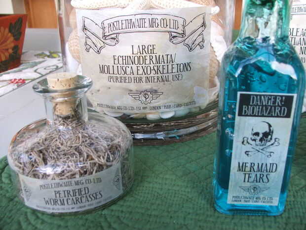 El "Blanqueado Atlante Coral Nuggets" (piedras blancas), "Canales de lombrices de tierra petrificada" (Liquen), "pequeños moluscos Exo-esqueletos" (cáscaras), "Huevos de sirena" (planta de esferas de hidrogel) y "Huevos de sirena" (gomina) fueron comprados en la tienda de dólar.