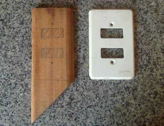 cometí el error de marcar molida la madera antes de que él, por lo que he repetido este proceso. Pone el switchplate original sobre la madera y marcar donde necesitas hacer agujeros, dependiendo del tipo de interruptor está cubriendo.