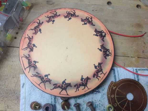 Quería aclarar el desorden de dos cables de iPhone en mi mesa de escritorio en mi cocina. Eran demasiado largo y sucio, así que pensé que haría una luz nocturna, USB x2 estación de carga. Pero puesto que sería visible a una gran cantidad de visitantes, pensé sería un dispositivo de entretenimiento así que ¿por qué no una máquina de la película? A zoetrope es un giro de la máquina de ilusión óptica del siglo que da la apariencia de movimiento. Google Zoetrope y encontrará fotos períodos para elegir. Elegí a un jockey de carreras de caballos muy clásico.