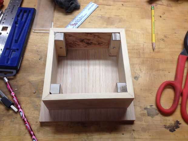 Yo escogí 1/2" roble (y lados cerezos) como me gusta la fuerza y cómo tienen manchas y son comunes maderas roble especialmente en cajas eléctricas de antigüedades. Así que hacer la caja o comprar una vieja caja de timbre del teléfono, ya podría trabajar también y la escala.