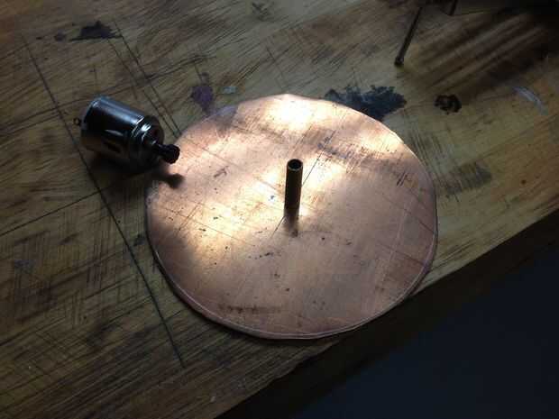 Con cuidado corte el disco de un metal conductor como el disco de rotación lleva la corriente para iluminar el LED blanco. Consigue el disco equilibrado lo mejor pueda. Asegúrese de que es tan plano como sea posible. Tómese su tiempo aquí para no tener el disco bamboleo como loco porque hará que el contacto en la parte inferior de las ups eléctrica recogida en al perder la conexión y el efecto estroboscópico no funcionará para congelar el movimiento del disco.