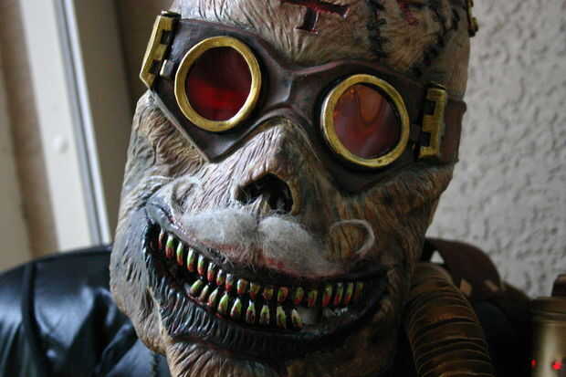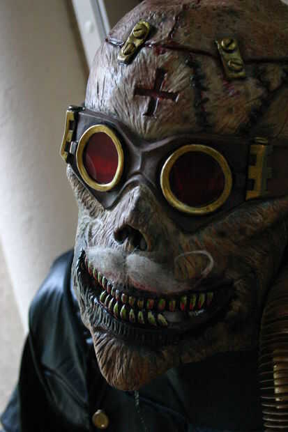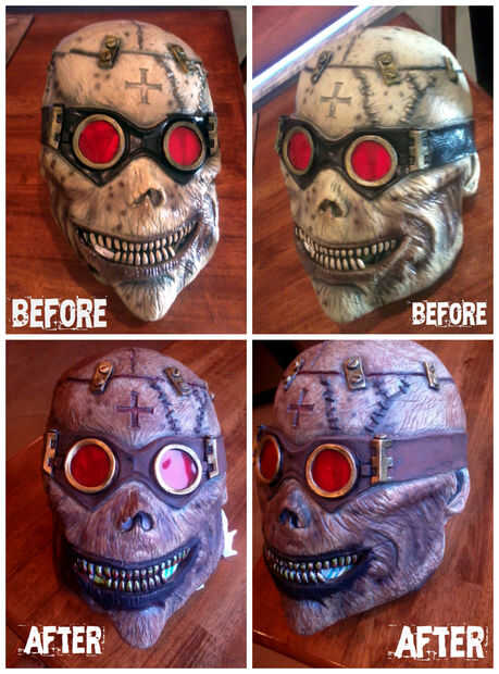 La máscara fuera de paquete era verde, tenía detalles con aerógrafo duras y un acabado brillante.  Utilicé una pintura marrón y ligeramente había pintada la máscara con un cepillo de espuma, siguiendo el contorno de la máscara. He pintado los detalles negro de las gafas con pintura marrón.   Originalmente fue sobre los detalles de metal plata con marcador permanente oro, que era demasiado ligero. Entonces fue sobre ellas con pintura acrílica oro antiguo. Entré en las grietas, los dientes y boca áreas con sharpies negro, verdes y rojos. Formé el bigote con pelo de perro (yo, lo he recibido de la escobilla de perro después del cepillado de la cola). También lo ensucian con tierra.  He utilizado cera de pelo para formar los extremos y el super lo pegué encima de la boca.  Para terminar la máscara utilicé un pequeño sangre falsa para escobillas en las grietas, labios y bigote.