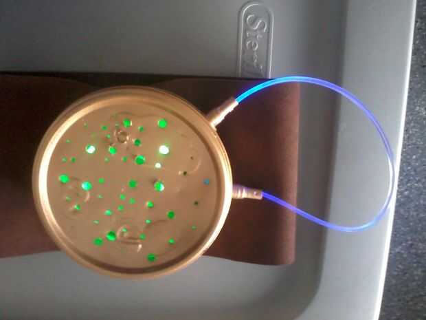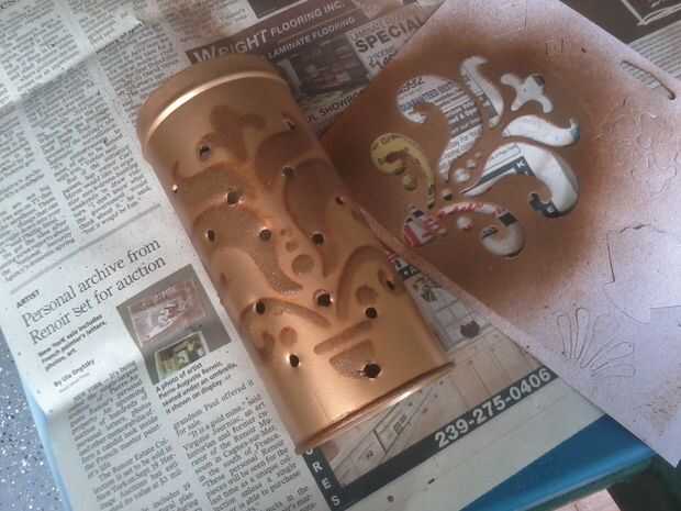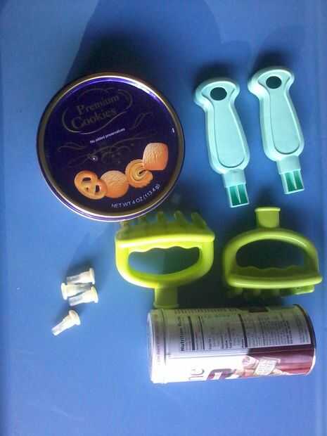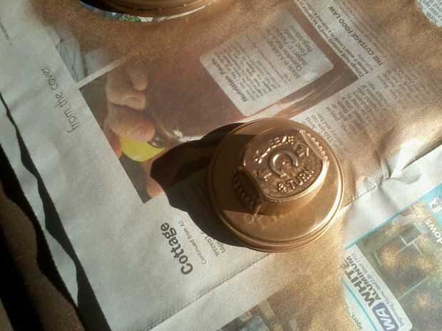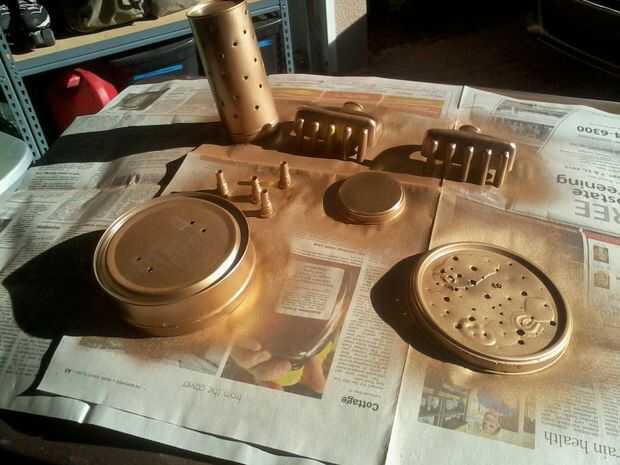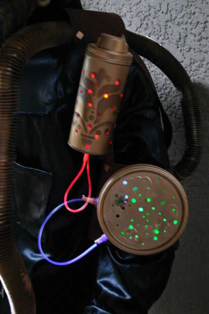 Para cubrir la banda roja del brazo en la manga, he hecho un pedazo de hombro y brazo. Tomé dos envases de galletas pequeñas y había perforado con varios agujeros de tamaño. Spray pintado oro antiguo. He añadido trocitos de plástico obtenidos de la bombilla de un enchufe en el ambientador de aire, también fueron pintados. Una vez seco había pegado las piezas plásticas de las latas de galletas pintadas. Hice a un fluer de lis con un stencil y pintura marrón. Entonces tomó de piel sintética y corte un brazalete (5 x 17), cinturones (2 @ 1 x 17) y una funda para el tubo (3 x 5). Había atornillado el brazalete en la parte posterior de la lata de galleta circular pintado. Con clavitos une el pedazo del hombro juntos. Inserta LED pulseras y cordones de los zapatos brillan en las latas.