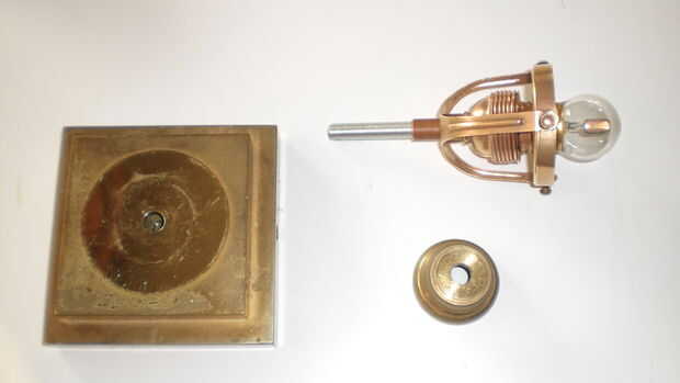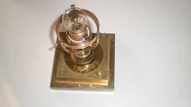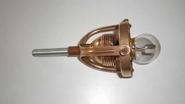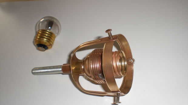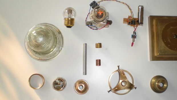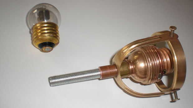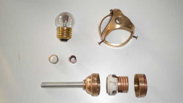 Muchos de las piezas de latón y parecía totalmente podrido. Pero les pulido un poco con alguna lana de acero después de un corto baño en ácido de vinagre (por favor, usar unos guantes de goma en este paso) dejarlos brillar otra vez. Para protegerlos contra oxidantes otra vez cubría con un claro barniz para metales (en alemán Zappon-falta) el antiguo titular del triángulo lleva a una pantalla hecha de vidrio o de metal esmaltado en cerca de 1900. Tal ves que me encanta trabajar con materiales antiguos de la época victoriana como un auténtico steampunk ;-))) el portalámparas sí mismo es también de latón y aislado con porcelana blanca.
