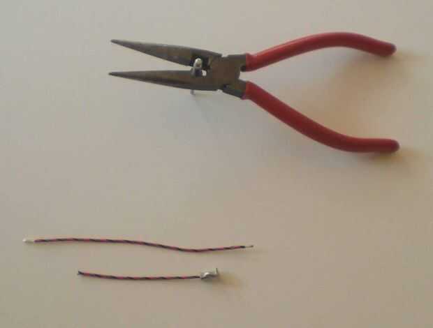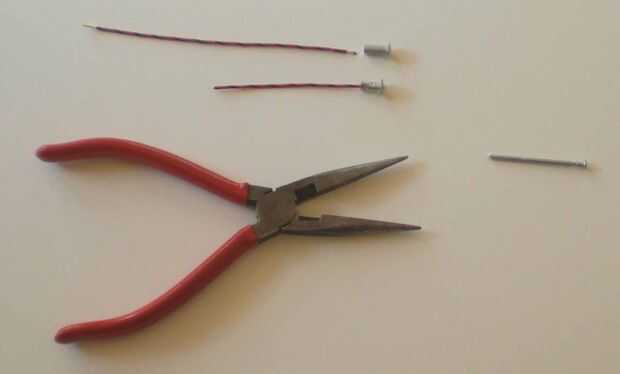 Para hacer los contactos para la lámpara de adorno, tomamos un cable eléctrico y la cabeza de un remache. Después de derribos ambos extremos del cable nos puso un extremo en el agujero y prensar el rivet´s cuello cuidadosamente dos veces, una vez girada a la derecha con los alicates.
