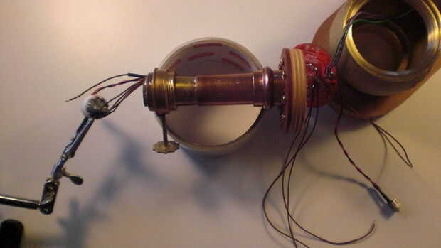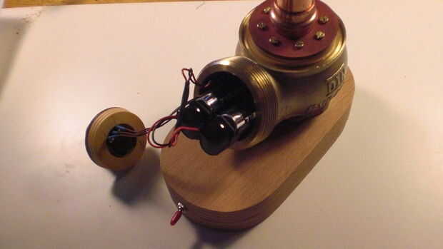 La segunda steampunked de ojo mágico winker funciona con el tubo de 6E1P aspecto fantástico. Puede ser alimentado por 4batteries del tipo AA y usted puede cambiar a la fuente de alimentación USB. Girando el POTI en el zócalo de latón E 27 puede influir en el contexto también.