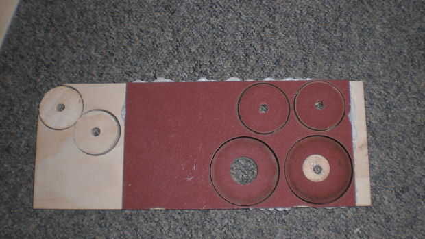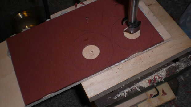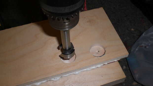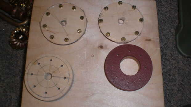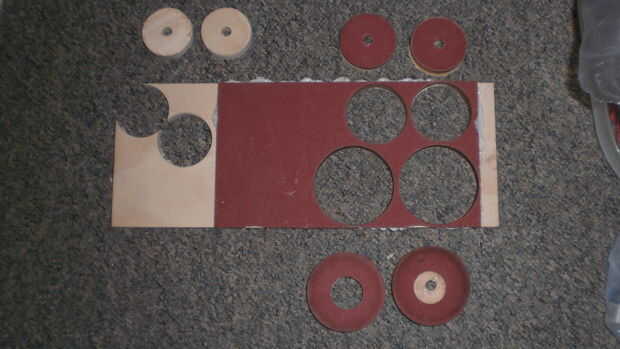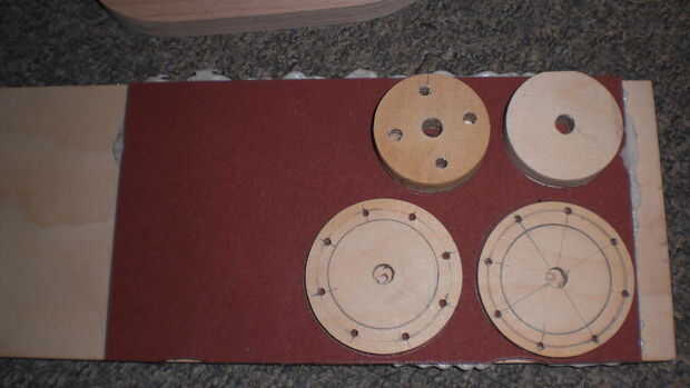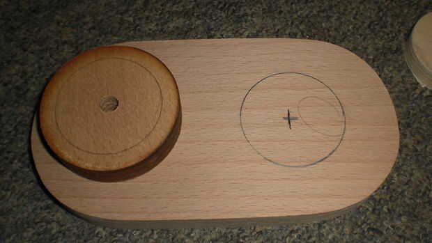 Para construir el soporte de madera tomaron dos piezas de contrachapado de 16 mm y fija con 4 tornillos. Después de formar a un óvalo corté un agujero grande con un serrucho en la placa superior. Luego combinó algunos contrachapado de 12 mm con mi amado 3mm chapa de fibra y había fijado con cola PUR. De placa de tis corte las rebanadas.