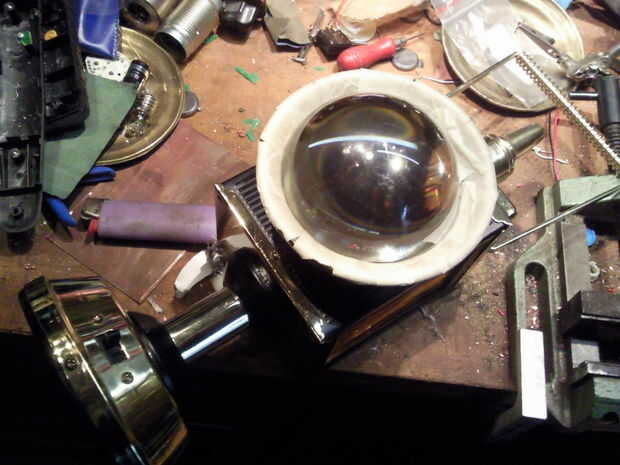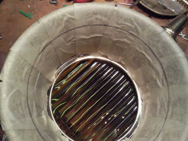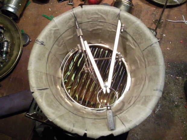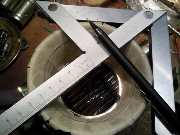 Para evitar arañazos y como un terreno para construir grabó el embudo con cinta de papel. A continuación Marque el diámetro externo del vidrio. Con la herramienta que ves en la foto woodturners se les permite encontrar el centro de objetos redondos y me ayudó demasiado. La construcción fue hecha en el embudo y por lo menos necesitaba marcas a 45-135-215-305 grados.