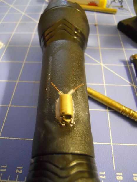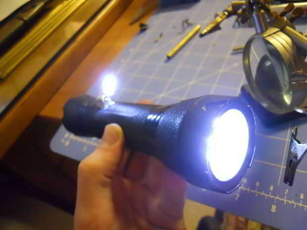 Aquí es donde entra el lado artístico. En este punto usted elige cómo desea que funcione. Para mí, era cool tener un LED fractura apagado e iluminando un tubo con agujeros en medio de los aparatos así que perforó un agujero en la manija de la luz (asegurándose de utilizar un punzón para evitar que la broca que vaga) y corrió los cables a través de un tubo de latón. Siguió el LED a los cables expuestos y me inserta en una longitud de tubo de latón que había estallado hacia fuera con una antorcha y presentar ranuras en. Tope los extremos de los tubos con masilla de epoxi de fontanero que es grande ya que es maleable como la arcilla y el rock duro una vez curado. En este punto he probado todo otra vez. Si todo funciona entonces proceda al siguiente paso!