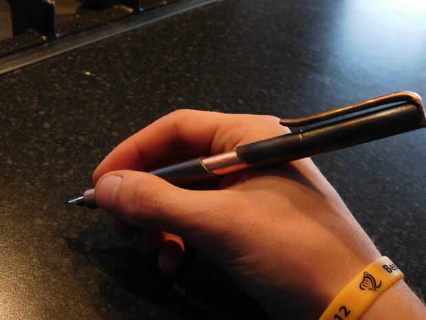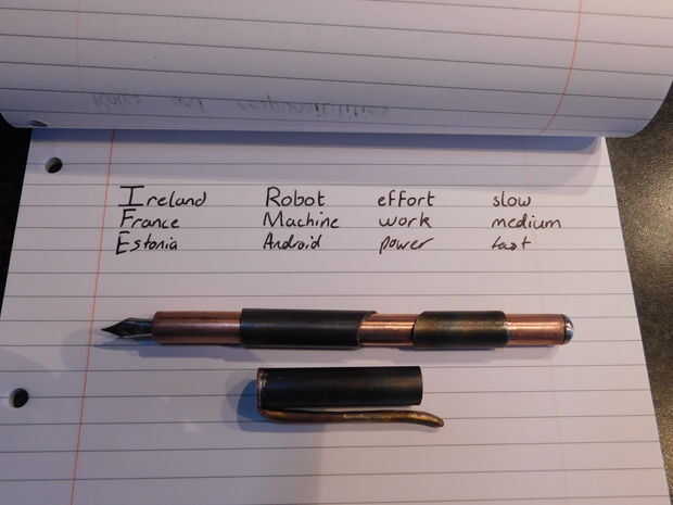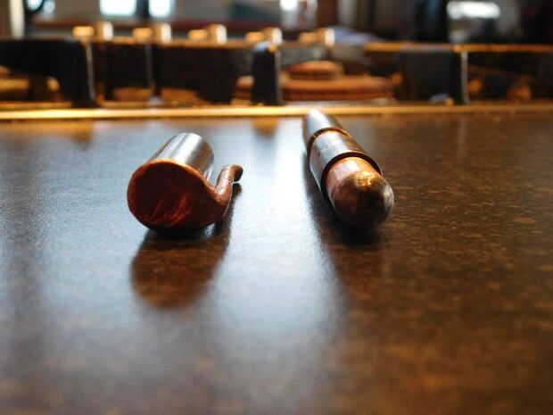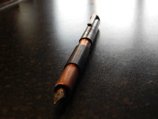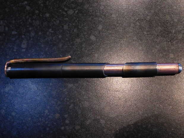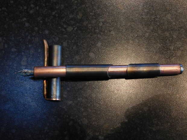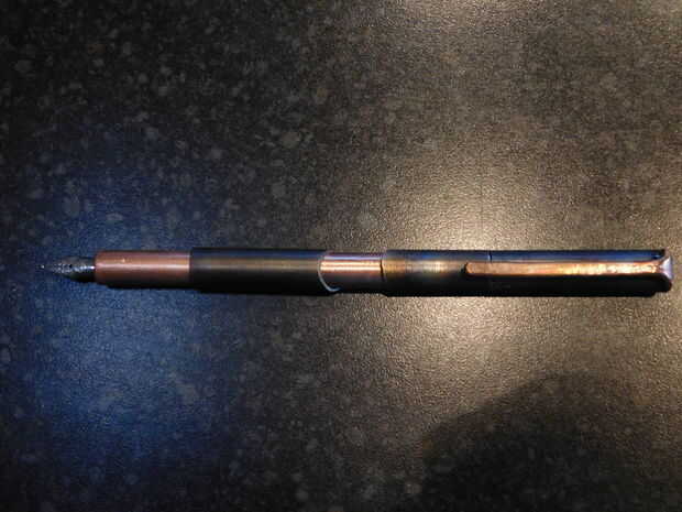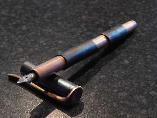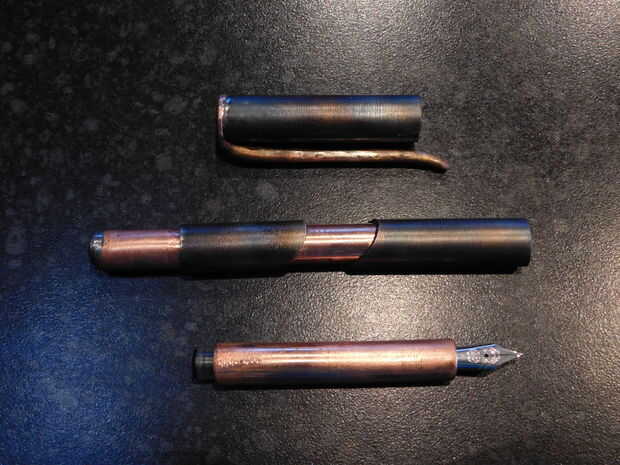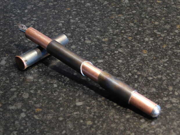 El cuerpo y la tapa se hicieron con un tubo de cobre y varios otros trozos de tuberías. La empuñadura se hizo pegar trozos de plexiglás y moliendo a la forma. La punta es una punta fina de Kaweco.