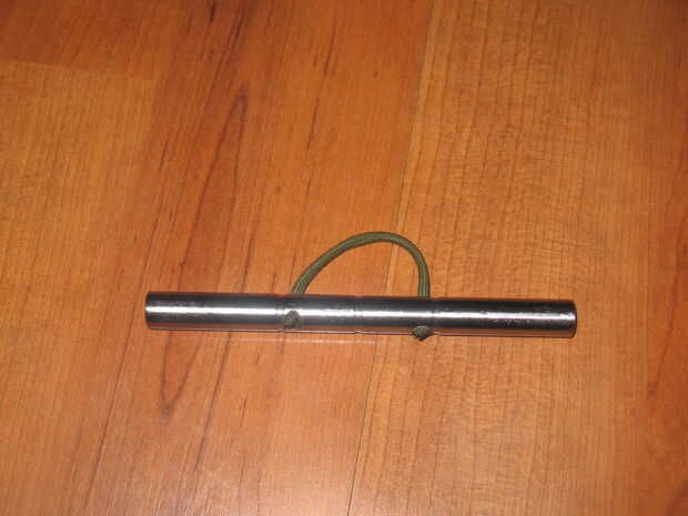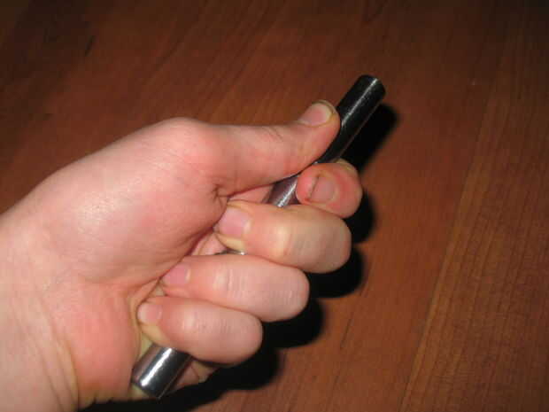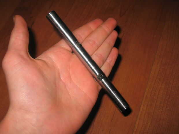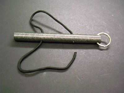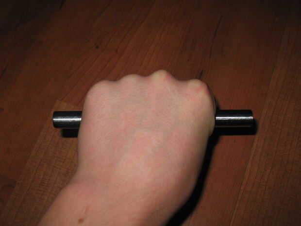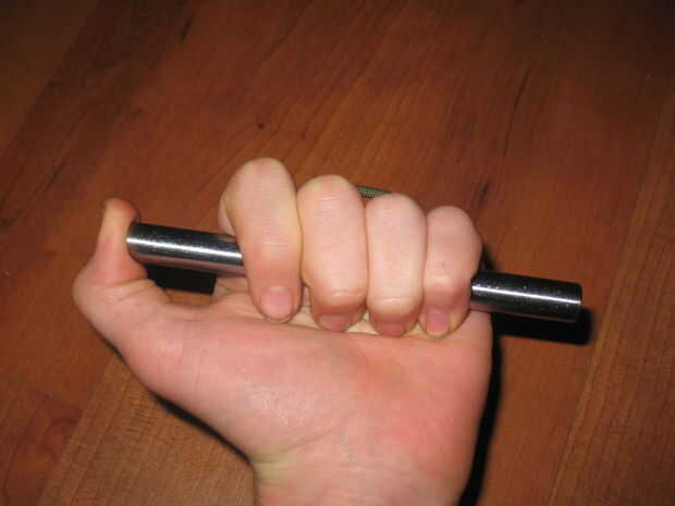 Es muy sencillo de hacer. Conseguir una varilla de acero de 1/2" y cortarlo para que se extiende 1 1/4" pasado que ambos de ustedes de la mano. Próxima a 1/8 broca y perfore 2 agujeros en la barra. Para determinar dónde deben ir los agujeros, sostenga la barra con ambos extremos sobresale de su mano. Ahora, hacer 2 marcas en el acero; uno en la parte externa del dedo medio, uno en el exterior de su dedo anular. Taladro sobre las marcas. Una vez hecho esto, utilice un 1/4" bits y a la mitad, taladro de perforación a lo largo del primer agujero. (Por favor, perdona mi falta de cuadros para el proceso, pero es lo suficientemente simple como para que palabras serán suficiente)
