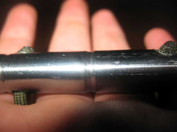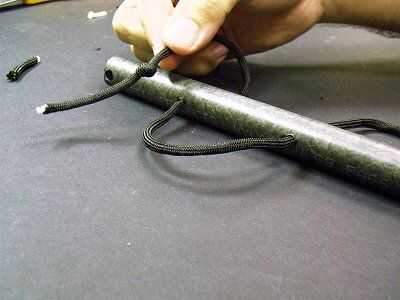 Obtener unos 6" de paracord destripada, un simple nudo en un extremo y del hilo de rosca aunque el lado avellanado del agujero. Ahora colócala en el otro orificio en el lado no avellanados. Mira las fotos para obtener ayuda. Finalmente, ajustar el paracord para que encaje perfectamente sobre el medio y los dedos anulares de la mano dominante retirar los dedos del lazo, apriete ligeramente y haga otro nudo simple. Tire el nudo en el agujero avellanado y listo.