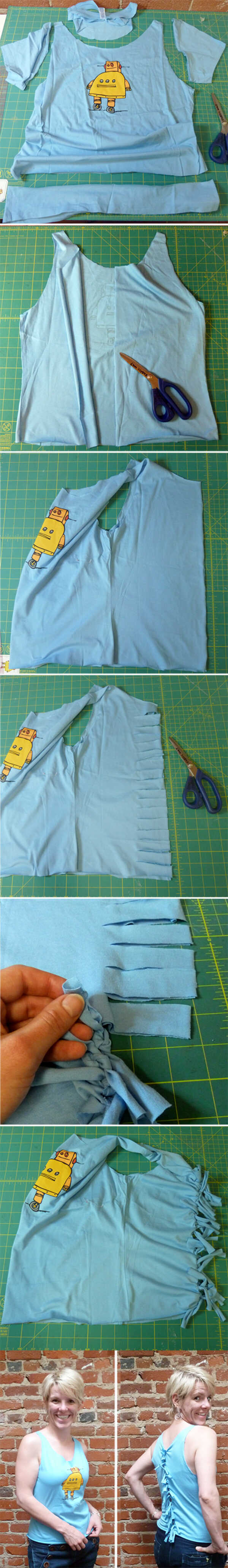 Puedes convertir tu vieja camiseta en un top de moda! Hay 2 formas, una para niñas y otra para chicos. (o chicas) La primera manera (cortar y atar los lados) se contrae su camiseta hacia abajo a un tamaño así que empieza con una camiseta grande.
