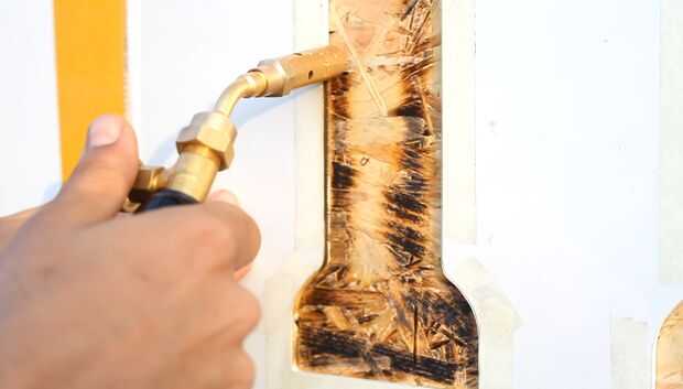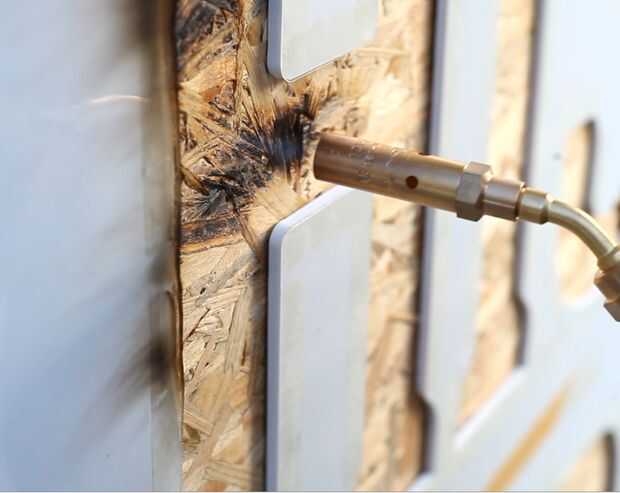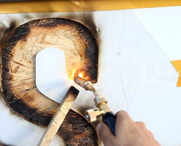 2 - comenzar a quemar los bordes en primer lugar. Si desea un acabado crujiente en los bordes tiene 1-2cm entre la antorcha y la madera y la quema con un ángulo de 90 grados, moverse rápido. Usted necesita para asegurarse de que no se están derritiendo la plantilla.