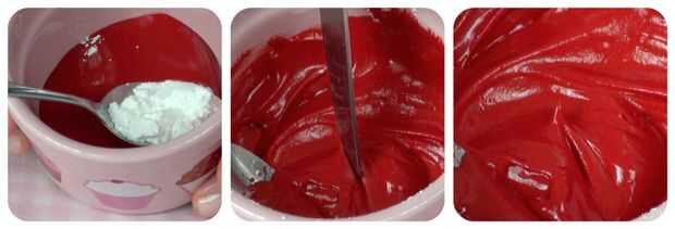 Hacer tu glaseado estarcido rojo un poco más gruesa que la inundación Glas añadiendo azúcar glas. Cuando se arrastra un cuchillo a través de la superficie de la guinda, básicamente todavía mantendrá su forma.