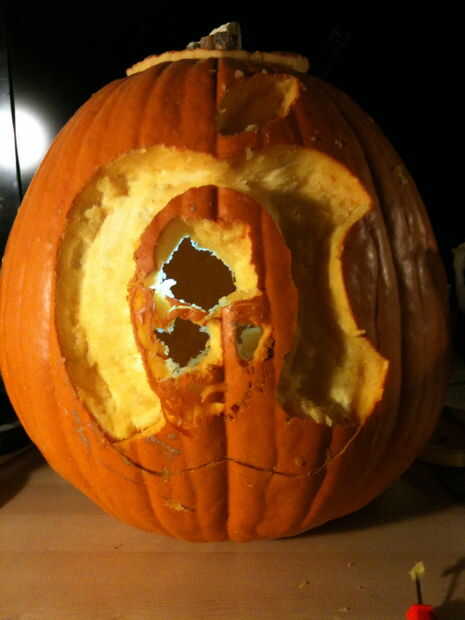 este es mi calabaza "Buscador" de Apple.(Es la toalla de papel para cubrir mi nombre)Paso 1: Se enciende para arriba usé una herramienta Dremel (muy vieja) para hacer las piezas más ligeras y más oscuras.Esta es la primera vez que he intentado e