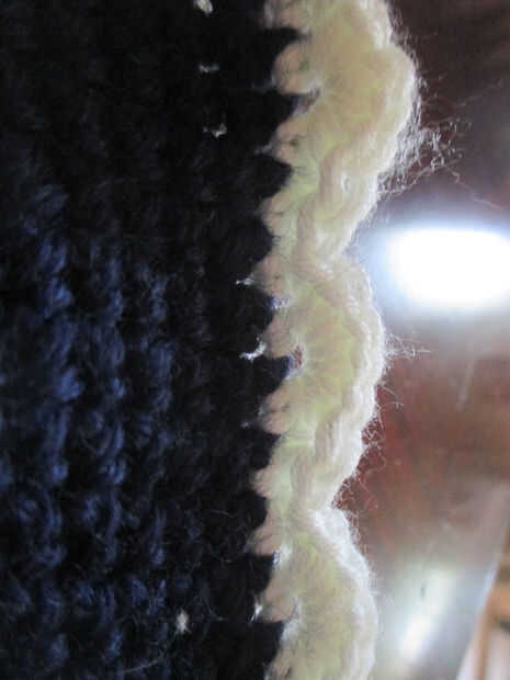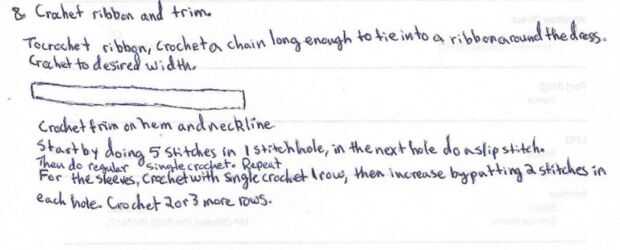 Ahora para la diversión parte! Crochet el guarnecido y tejer de la cinta. Esta es la parte más fácil. Al crochet la cinta sólo hace una cadena de tiempo suficiente para atar alrededor de su cintura en una cinta. Entonces solo crochet a la anchura deseada. Para la guarnición, consigue el hilado utilizado para la cinta (usé blanco lechoso) y un nudo del resbalón. Crochets solo hacer 5 en el mismo punto, hacer una puntada de resbalón en la puntada siguiente, repitiendo el patrón hasta terminar. Para las sisas, ganchillo a punto bajo y luego aumentó el doble en la segunda fila (hecha 2 puntos en cada punto) y unas filas más de ganchillo.