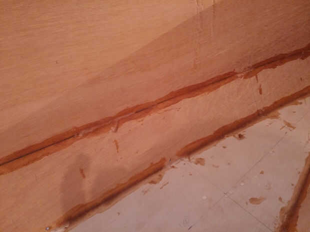 Mezclan algunos resina poliester (que estaba usando una escala en ese punto) espesada con aserrín fino de mi lijadora orbital. Funcionó bien, excepto que estaba oscuro. Leí en alguna parte que algunas tiendas venden color gradual espesante o "harina de madera". Pero una mirada por la ventana en montaña de la mesa en la distancia me aseguró que aún vivo en África y sí, probablemente encontraría harina de madera en alguna parte, pero en vez de salir en una expedición, estaba contento de usar mi propio "harina de madera"... Ya no tenía ningún problema con ella y probablemente hará lo mismo en el futuro.