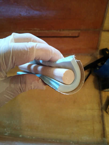 Esta solución, utilizando un taco como curva guía, con alguna esponja de colchón camping envuelto alrededor de él, se convirtió en una herramienta muy querido. Pude guardar mis músculos de mano y del dedo, mientras se aplica la máxima área lijado al vidrio. Los montones de polvo de vidrio rápidamente construido usando este método de lijado.