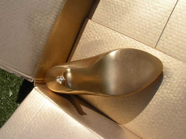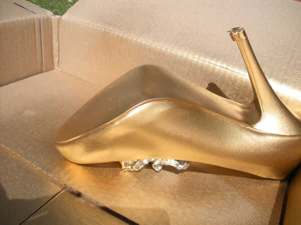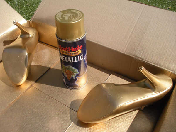 Pintura el zapato puede ser tricksy a recoger el zapato esté en posición vertical para ser rociado si rellenar el zapato después de su enmascarado con arrugada encima de papel de aluminio/Bakeafoil a molde de zapato y el suelo debajo de él, ayudando al stand de zapatos mientras que boca abajo listo para rociar.