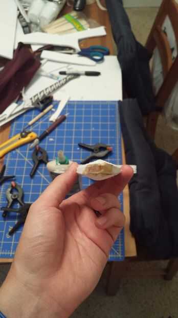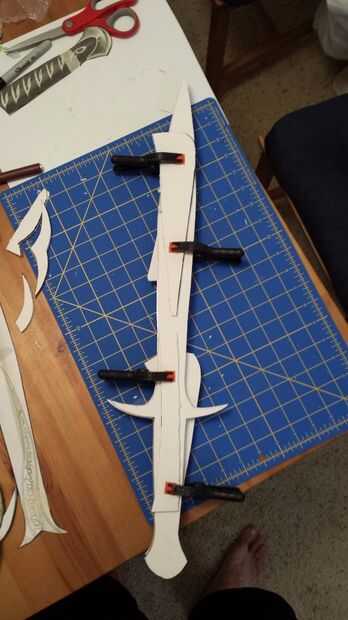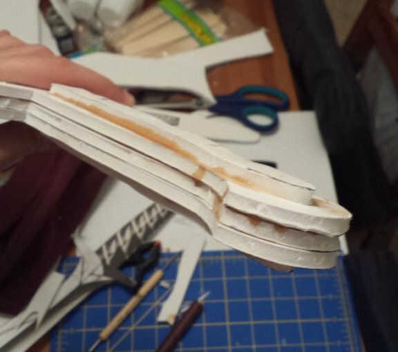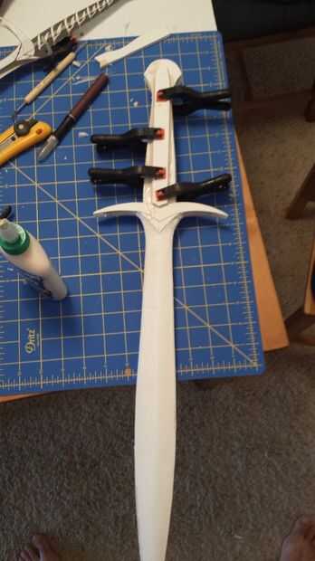 Luego aplica pegamento para madera para las piezas y fijar, asegurar eran tan alineados como podía y dejarlos curar. Después tuve las tres piezas base pegadas juntos sentí que necesitaba agregar a la empuñadura que no utilizar una tonelada de arcilla para construir. Había pegado dos piezas pequeñas en el agarre y además eso seco.