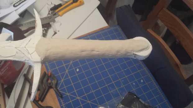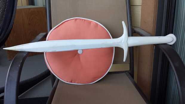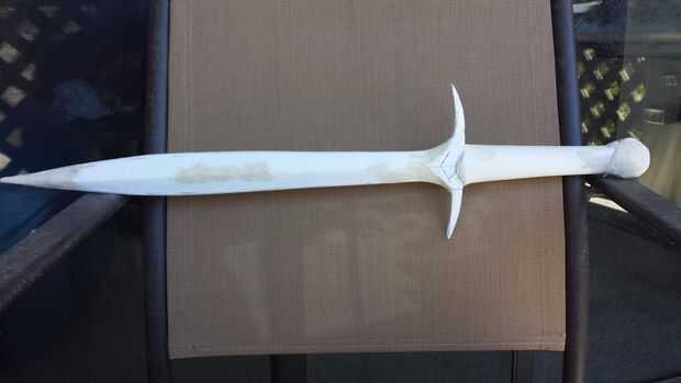 Después de la hoja y el mango fueron desbastadas con corte y lijado, apliqué spackle a la hoja. Dejé se seque y mientras tanto he aplicado arcilla de aire (también llamado arcilla de papel) a la empuñadura y el pomo. Al final cambié mi diseño de pomo del diseño original de la hoja para hacer mi propia. Una vez seco el compuesto de juntas me enarenó y otras en forma de la hoja. He añadido algunos arcilla de aire la hoja y punta para reforzar ya que la punta estaba tan flaca y yo sabía que si no era obligatoria se rompería. Una vez que ha secado la arcilla arena todo abajo a partir de un documento de cuenta bajo grano 80 y pasando posteriormente hasta un 320 agradable. Arcilla del aire se puede alisar tan bien! Agregué más arcilla para el protector de mano y comenzó a formar con mis herramientas de arcilla. Una vez que ha secado he perfeccionado la forma con papel de lija y dio todo un buen alisado de.