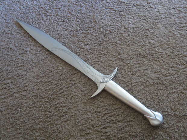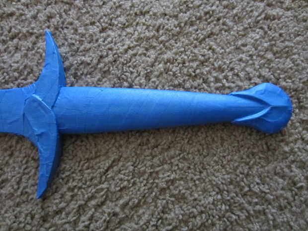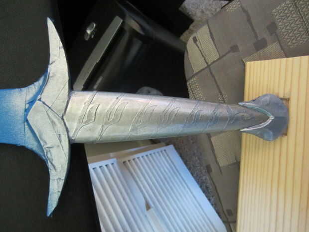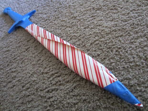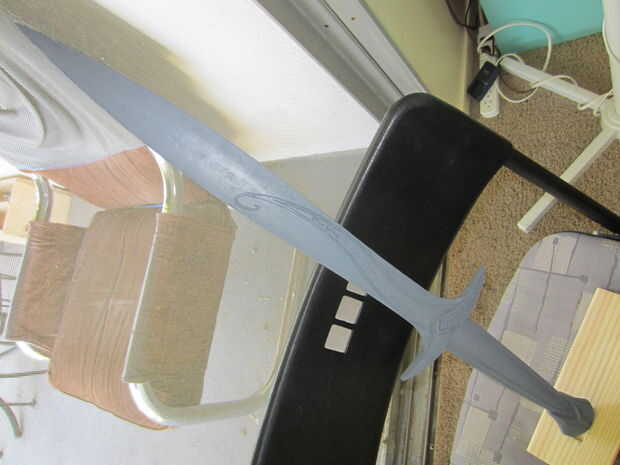 Ahora para la parte difícil: conseguir un efecto de incrustación de plata del puño. Envolver todo el agarre en cinta adhesiva y cinta algún diario (realmente utilicé papel de regalo) a la empuñadura y pomo. Nos estamos centrando nuestra atención en la empuñadura en este punto. Usando la plantilla adjunta (sting_leaf_pattern.pdf), Esboce el contorno del patrón de la hoja encima de la cinta adhesiva. Con el X-acto cuchillo, corte con cuidado la cinta adhesiva a lo largo del patrón. No corte demasiado profundamente, o vas bien en el MDF. Ahora, con cuidado retire la cinta adhesiva sobrante dejando sólo el patrón de la hoja.