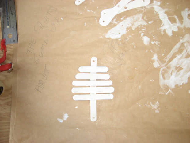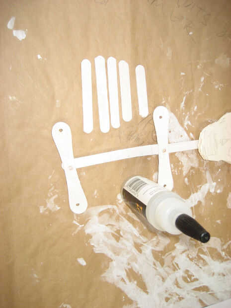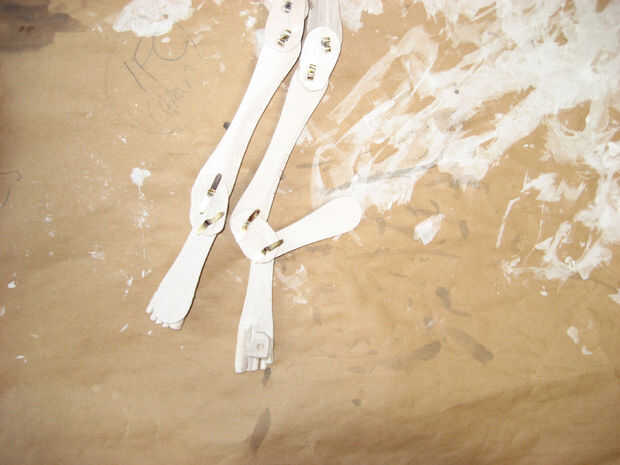 Los pies tienen dedos del pie de big del pincho de tamaño más grande. Pegar un trocito de palillo pop junto al dedo gordo a todo nivel, luego pegar la pieza superior de pie sobre la parte inferior con los dedos del pie.