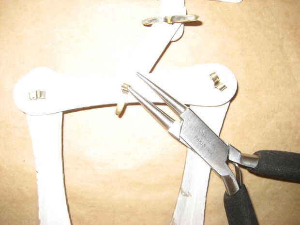 Después de poner los clavos a través de, usé un alicates de punta redonda para hacerlas rodar bajo y mantenerlos fuera del camino. Esto es también cómo se puede ajustar la tensión - para floppy, no baje los clavitos firmemente, para 'mantener una pose' endurecer.