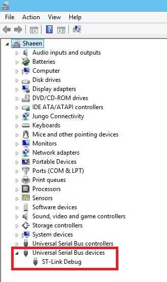 Para comprobar si correctamente instalado Controladores para el STM32 tablero o no, goto "Panel de Control" > "Administrador de dispositivos". Allí bajo "Dispositivos de Bus serie Universal" encontrará "ST-Link Debug". Si no ve que algo como eso significa que no tener instalados a drivers correctamente. Vaya al paso 2-5 para instalar los controladores.
