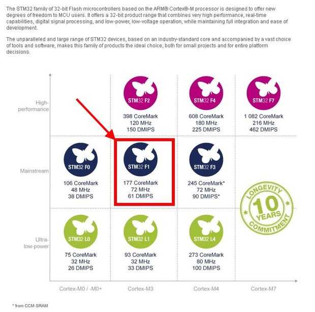 Como podemos ver en los gráficos anteriores, nuestro microcontrolador alinea en el medio, en términos de rendimiento y memoria. Estos gráficos son imágenes del sitio del ST: