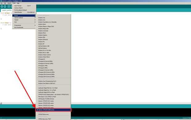 Ahora podemos iniciar el IDE de Arduino y seleccione STM32F103RB genérica como en la foto de arriba.