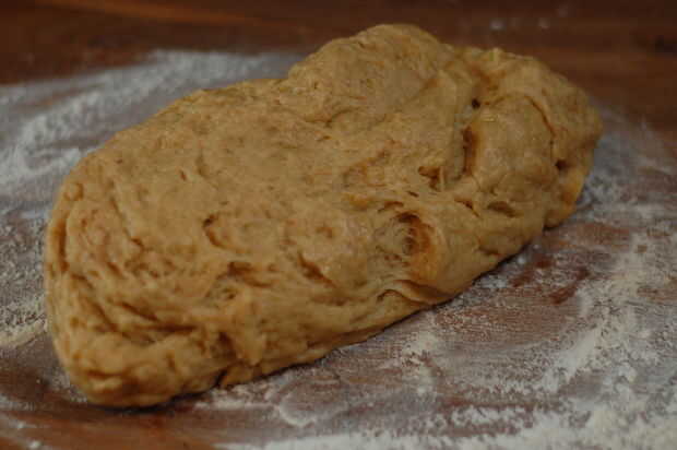 6. Para la etapa siguiente los brazos va a entrar un poco de trabajo pero en la radio y la harina la superficie de trabajo entonces se atascan en amasar durante 15 minutos o hasta que quede una masa lisa. Puede que necesite añadir más harina pero trate de no añadir ninguna más de lo absolutamente necesario.