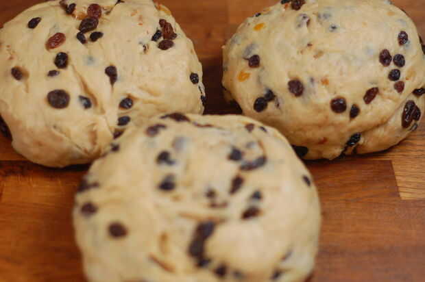8. Dividir la masa en el número de stollen que desea hacer y colocar en para separar tazones de fuente con mantequilla, cubrir con film transparente y dejar para subir en un lugar cálido durante 3 horas o hasta que se triplicó en tamaño.