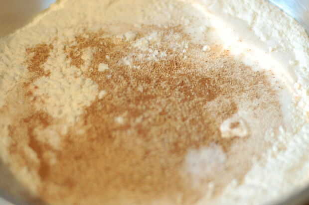 2. Reserva 2 cucharadas de la harina a un lado luego poner el resto en un recipiente grande con el azúcar, sal, especias y levadura.