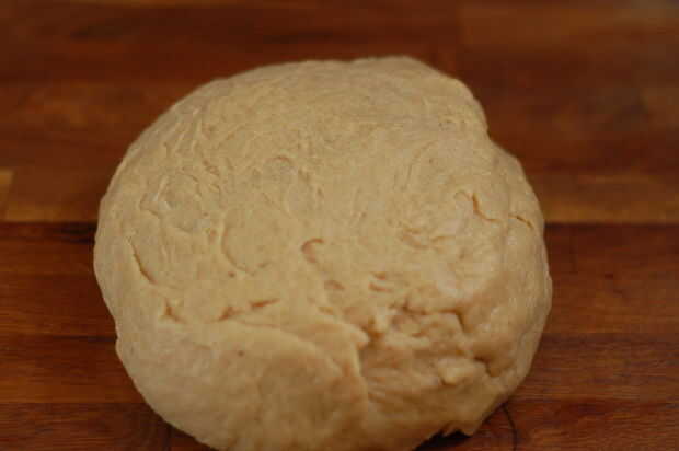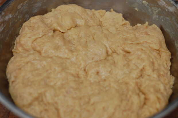 5. Ahora, hacer un pozo en el centro de la harina y las especias y verter en la mezcla de leche y mantequilla. Reunir todo lo que ya tienes una masa pegajosa. Esto es más fácil con las manos. Deje por 10 minutos.