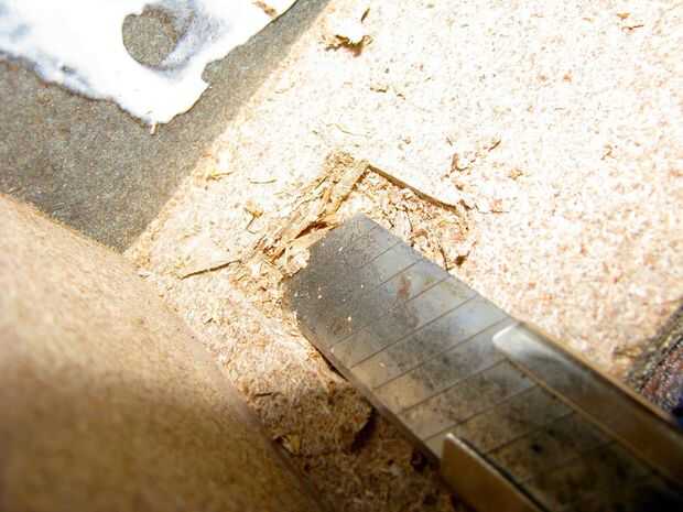 Mi caja era demasiado gruesa, así que corte una ranura en el interior de la caja para que la tuerca podría caber en el conector una vez que fue puesto a través del orificio. Hice esta usando un cuchillo y fue fácil para mí porque mi altavoz fue hecha de tablero de partículas. Si la caja del altavoz es de madera mejor, puede que necesite utilizar un cincel, dremel o creativo para descubrir una solución.