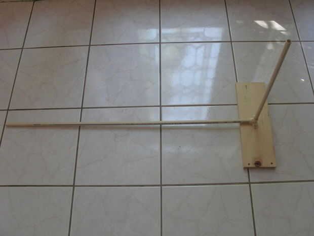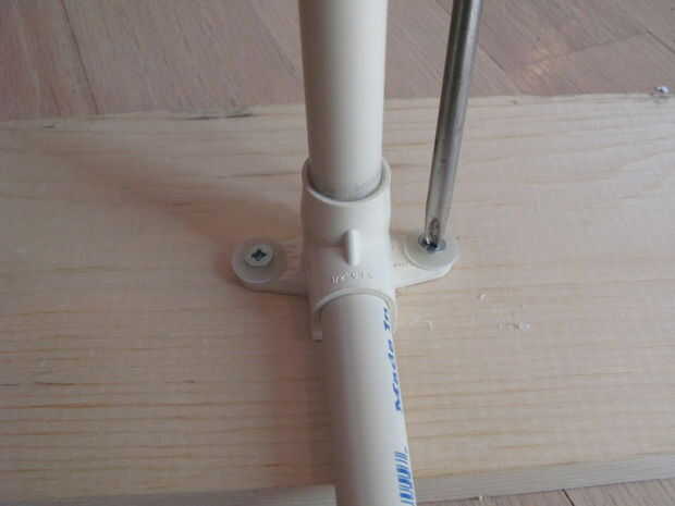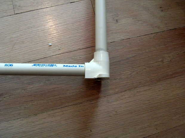 Cortar tubo de PVC en dos piezas. Tenía una sola pieza (eventualmente horizontal) que era aproximadamente de 3.5 pies y otro (eventualmente vertical) que era aproximadamente de 1.5 pies. Pegue las dos mitades en el codo del ala. (Yo usé pegamento, aunque sería mejor cemento de PVC. No has probado el pegamento gorila. La presión no debe ser muy grande porque los diseños no deben ser herméticas.) Consigue un trozo de madera de desecho y atornille el codo sobre la misma.