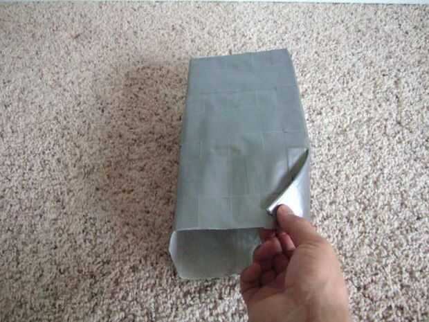 En el extremo abierto de la bolsa, doblar las esquinas en un pliegue triangular para reducir el tamaño de la abertura. Cinta dentro y fuera de estos pliegues.