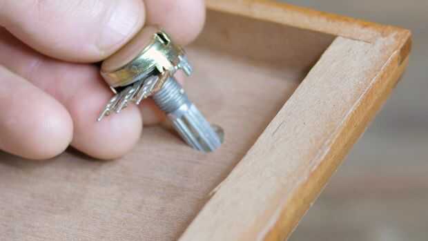 Si se usa un potenciómetro, es perforar un orificio a través de la caja de cigarro donde desea que el botón de volumen para colocarse. Podría ser en la parte superior o en el lado de la caja, siempre y cuando no sea en la forma de utilizar el aparato correctamente. La perilla de plástico debe salga con poca resistencia, permitiendo que el potenciómetro para insertarse en el orificio perforado desde el interior. Una tuerca y una arandela generalmente vienen incluidas por lo que se utilizan para luego fijar el bote en su lugar y presiona la perilla en la parte superior.