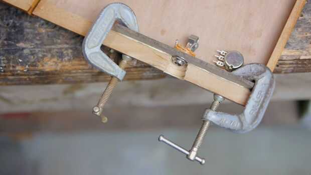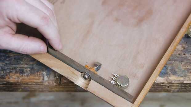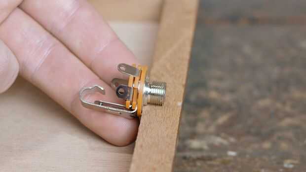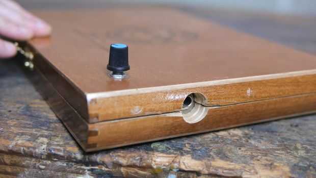 La toma de audio que estoy usando para este proyecto es un jack estándar 1/4" para trabajar con cables de guitarra de 1/4". La parte roscada de la toma no es muy larga, así que me encontré con un poco de un problema en el montaje al lado de mi caja. En el lugar de montaje directamente como se hizo con el potenciómetro, me perforaron completamente a través de la pared lateral y había montado a la toma a un pedazo mucho más delgado de tablero de partícula. Esta chatarra fue entonces pegado a una mitad del interior de la caja, hacer el gato accesible mientras sigue permitiendo la caja abrir y cerrar.